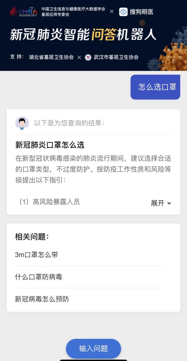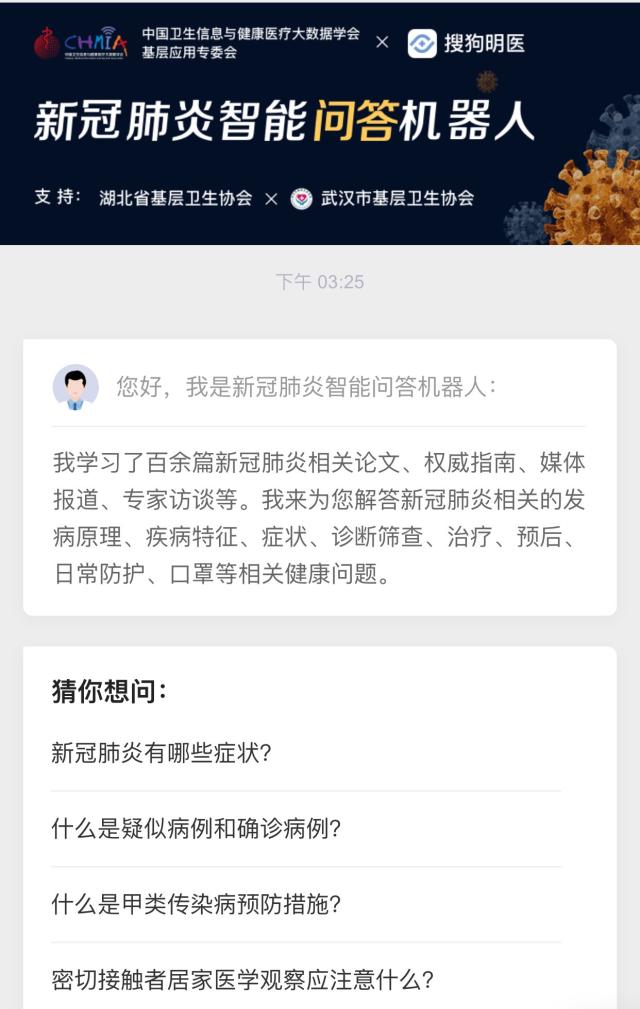 为了更加及时、高效、精准的解答您关于疫情及疫情相关的健康疑问,降低不必要的就医带来的交叉感染风险,中国卫生信息与健康医疗大数据学会基层应用专委会联手“搜狗明医”,在中国健康教育中心的指导下,共同开发并推出“新冠肺炎智能问答机器人”工具。