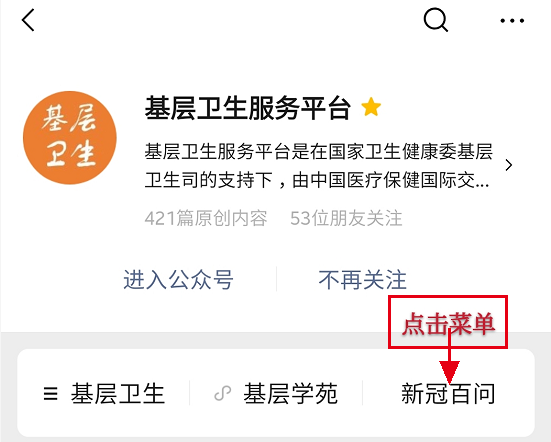 同时,还可关注《基层卫生服务平台》(ID:jcwsfwpt)微信公众号,点击“新冠百问”菜单栏直接使用(如图所示)。