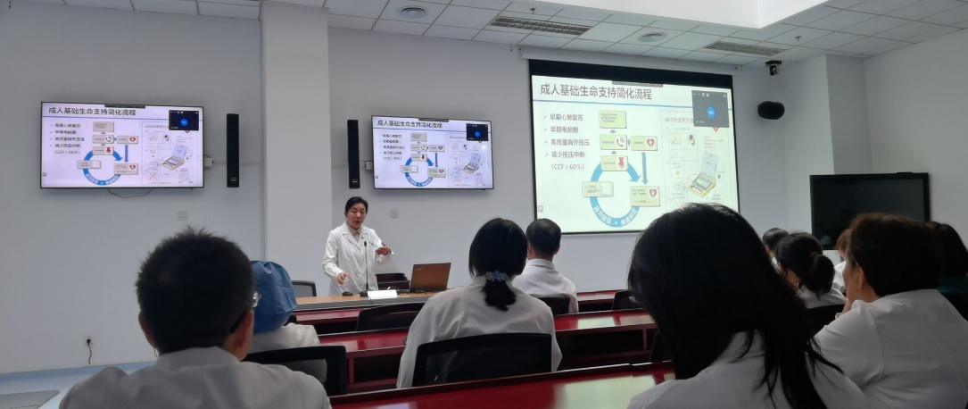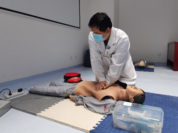 校医院先期派出业务骨干参加北京市海淀区医学救援中心组织的急救培训,之后将规范的心肺复苏核心理论、操作技能与流程进行全员培训。培训分理论讲解、操作演示、实践操作环节。理论讲解着重心肺复苏流程和高质量复苏要素,清晰梳理每一个知识点。操作演示中准确示范、拆分解读每一个动作的要点和细节。大家争先恐后进行实践操作,反复练习,力求动作精准无误。